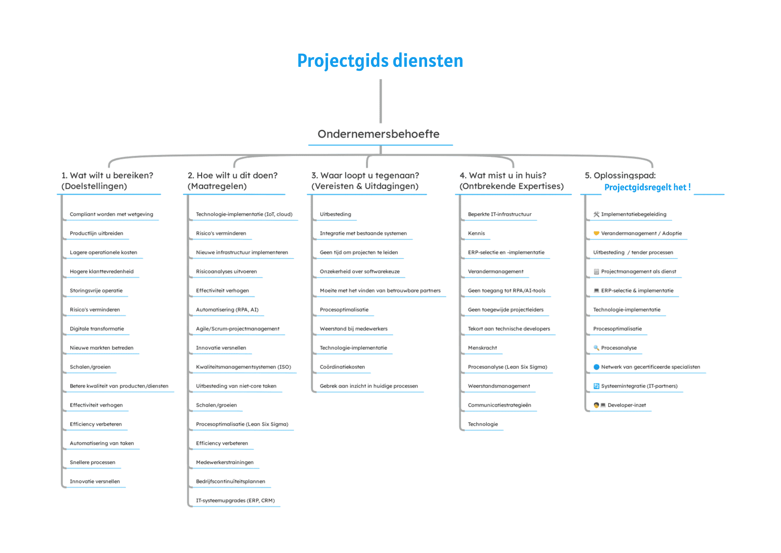Ben je benieuwd wat voorbeelden zijn van de zaken die de Projectgids voor je geregeld kan krijgen? Kijk dan naar onderstaande Mindmap.